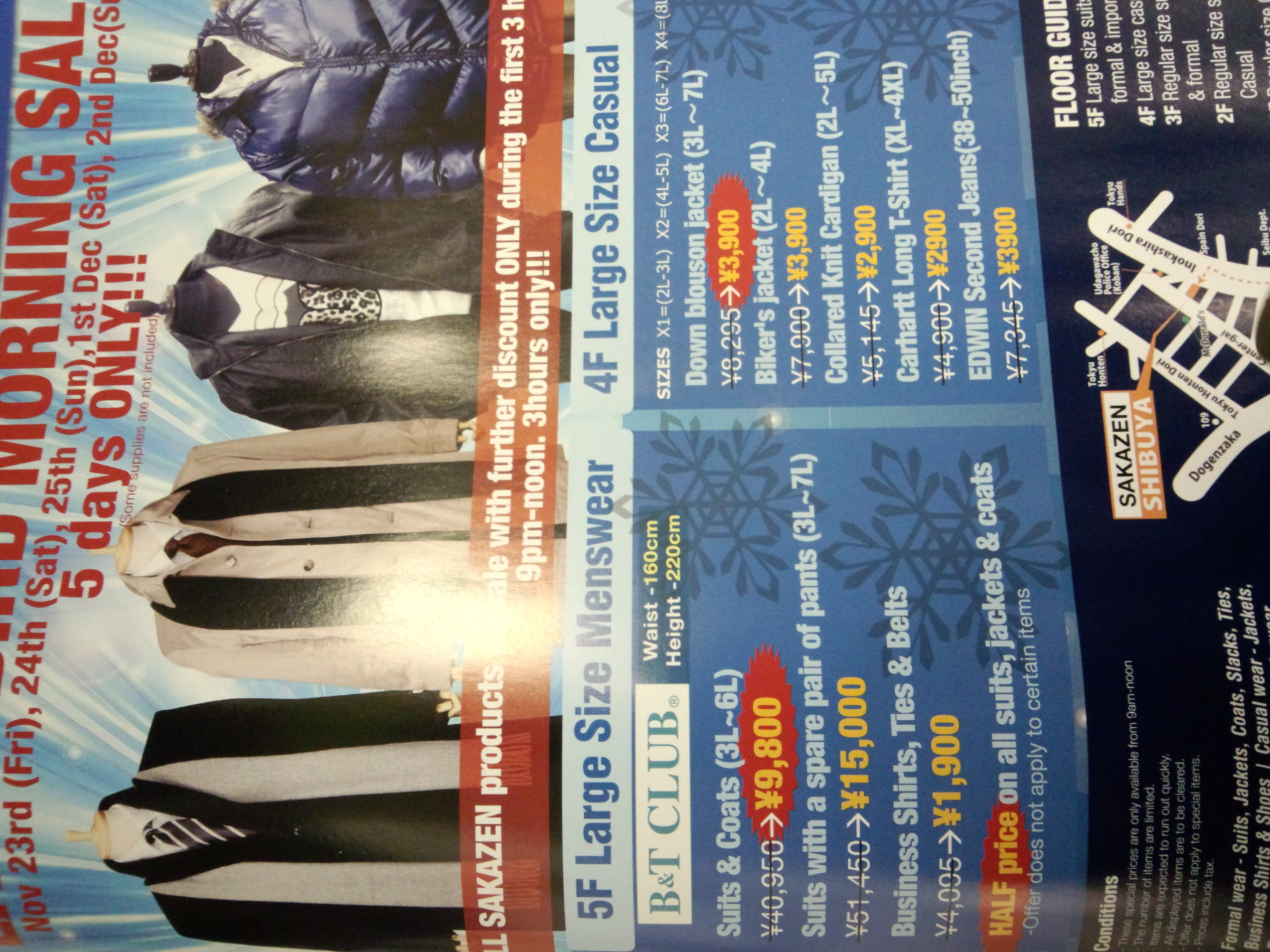ものにより5XLBや6XLBもあるのでかなり大柄な人でもOKでしょう、ただし丈は4XLBと同じくらいで横に広がっていくようです。インターネットで購入可能ですよ。