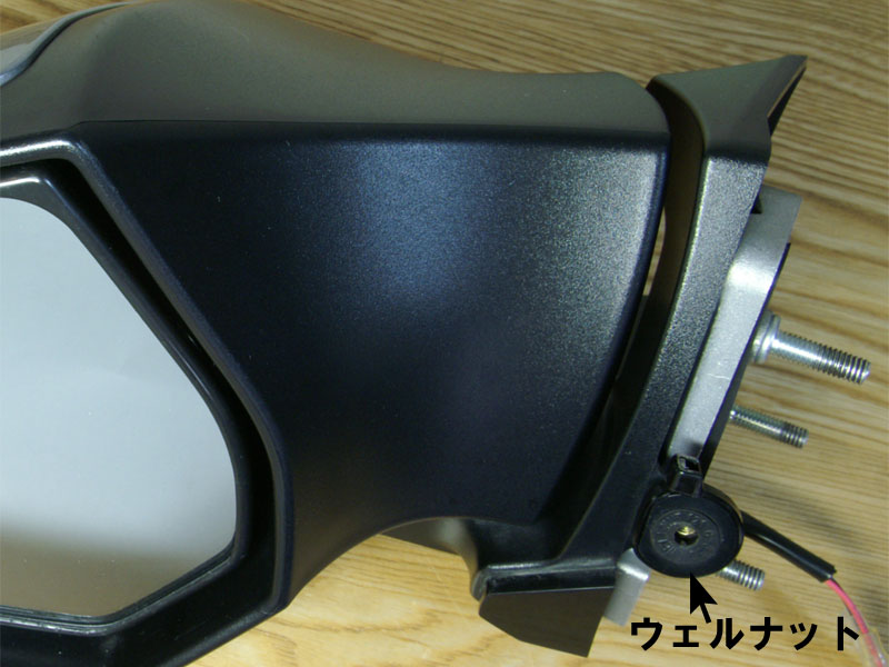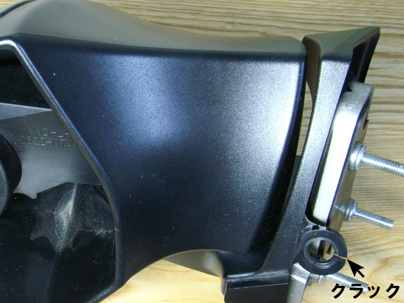さださんがおっしゃっている「メネジは真鍮製で周りをゴムライニング」はウェルナットという部品です。受け側がウェルナットの場合は、ボルトは指先で回らない程度に締め付ければOKです。そういう部分にしかウェルナットは使われていません。ウェルナットは樹脂部品にはめ込まれていることがほとんどですが、ウェルナットで受けているボルトを強く締め付けると、ウェルナットを保持している部分に過大なストレスをかけることになります。例えばインナーカバー(カウリング上部の黒いカバー)を留めているボルトのひとつは、バックミラーにはめ込まれているウェルナットと締結しますが、ここを強く締め付けるとウェルナットを保持している部分にクラックが入ります。(下図を参照ください。)