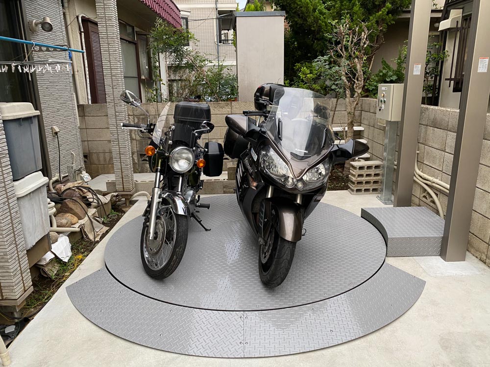 1400GTR購入時に半分程度アスファルト化し、真ん中あたりに少し窪みを作って、「マワール」という回転台を設置し、