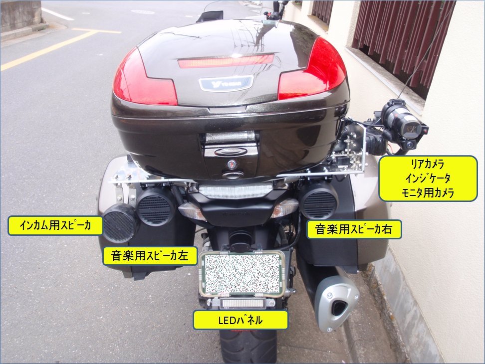 音楽用スピーカ左右:走行中公道では音楽鳴らす趣味無いので、整備中に聞くくらい。集合時の合図に音楽慣らすのはありかな?
