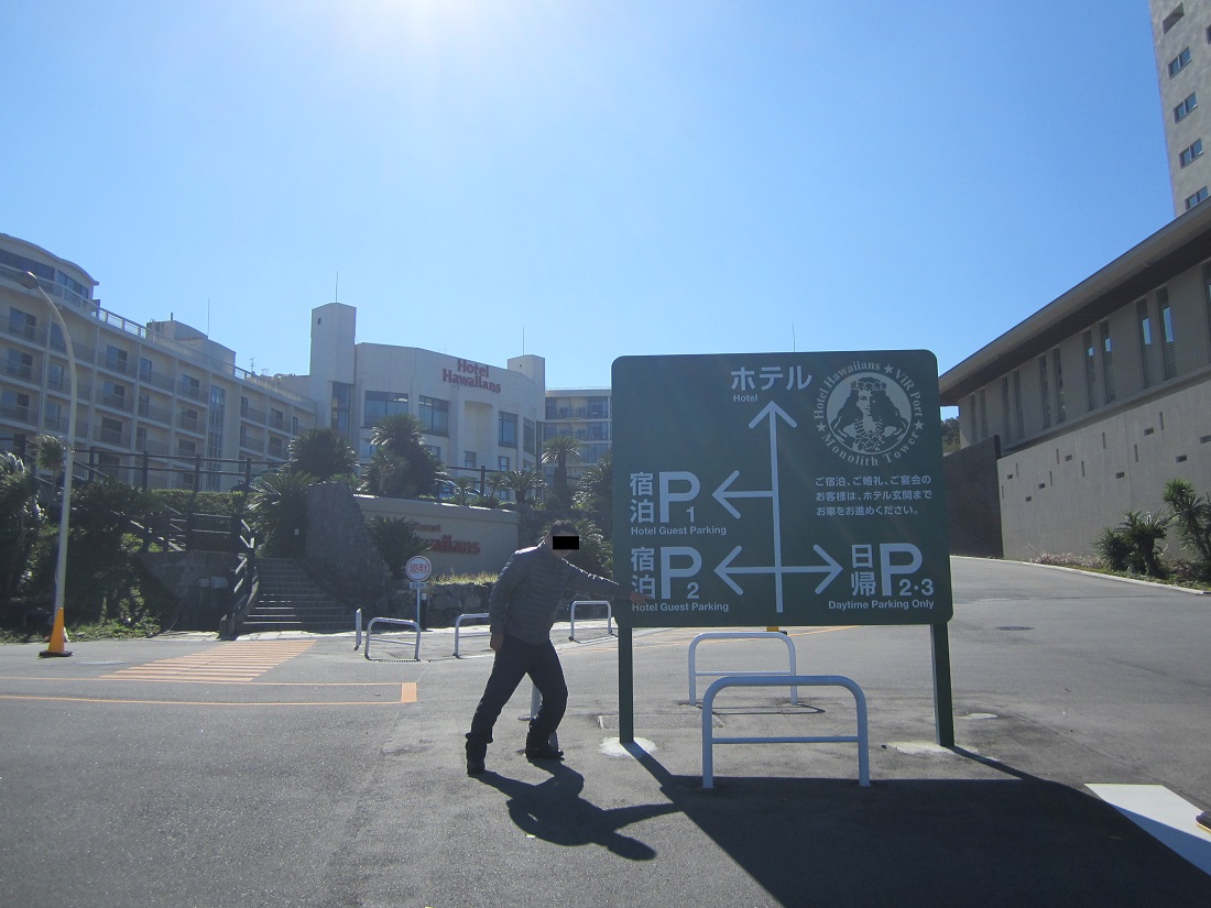 ザックリ書きますと、ホテルハワイアンズの建物付近に立体駐車場がございます。立体駐車場の一階にバイク専用駐車スペースはありますがそこには止めず、スロープを使い二階に上がって頂きます。上がって頂きますと、どこかしかに専用スペースが設けられております。