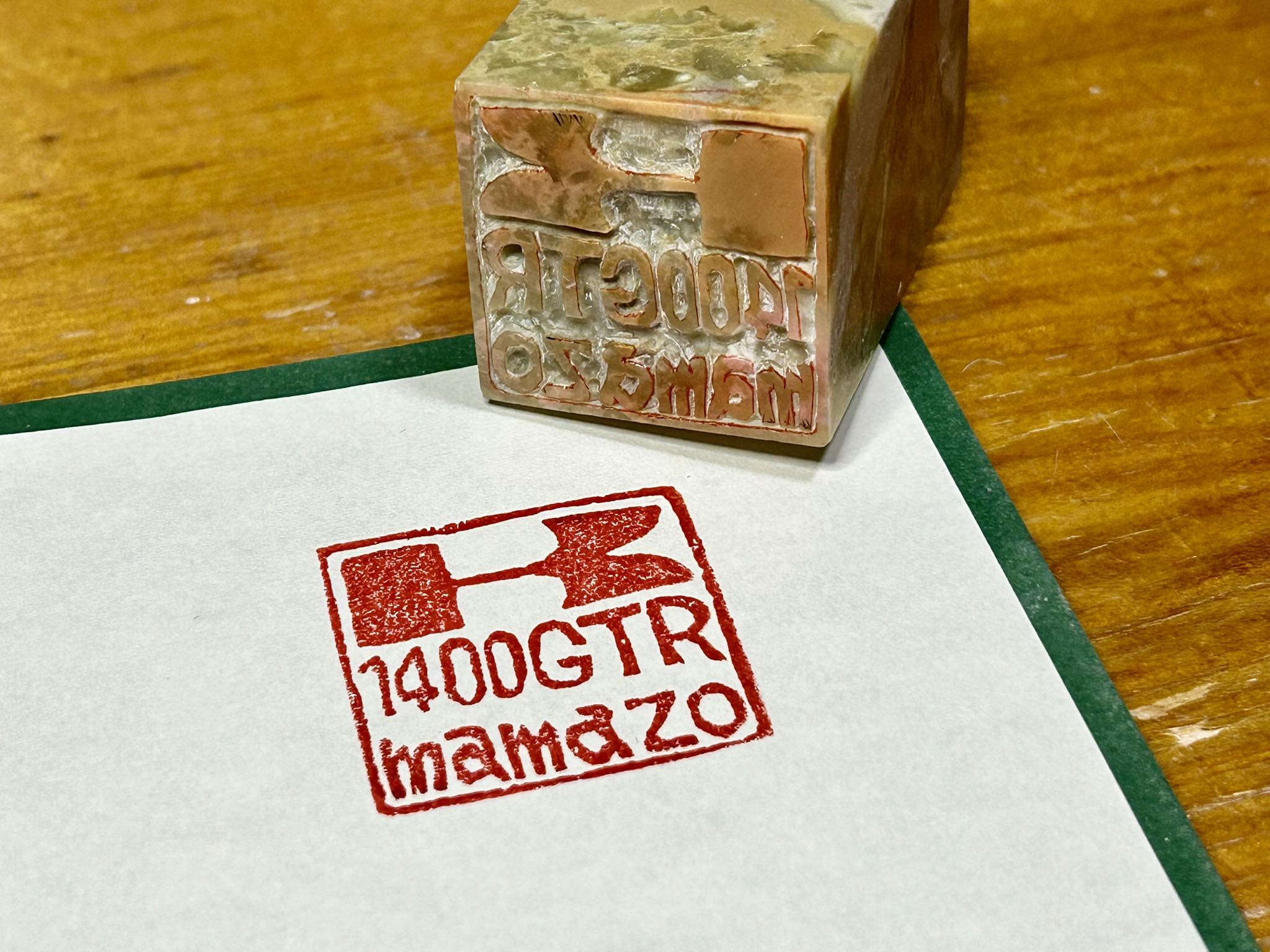カワサキのロゴ?に1400GTR+ハンドルネームを彫って。