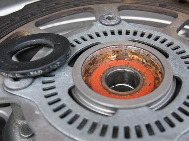 引き上げて点検するとフロントホイルベアリングの2つあるうちの右側(ABS側)がガタガタに(驚)。