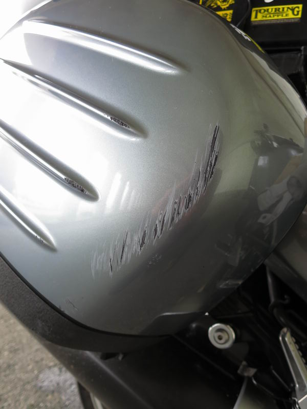 最初の2回の立ちゴケでパニアケースは少し傷つく程度で済んでいました。(未交換)