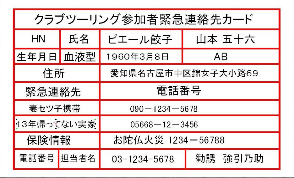 で、オイラは常にウエストポーチと車検証(シート下に入れている)と一緒にライフカードと称して一枚のA4の紙を入れています。